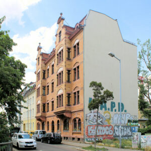 Das Wohnhaus Aurelienstraße 8 in Lindenau steht nahe der Philippuskirche in heute offener Bebauung am Karl-Heine-Platz.