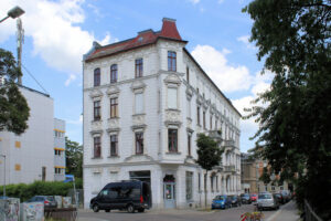Das Wohnhaus Aurelienstraße 4 in Lindenau steht nahe der Philippuskirche in heute offener Bebauung am Karl-Heine-Platz.