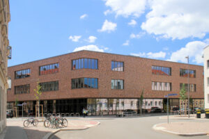 - langgestreckter, abgewinkelter Baukörper, dahinter Turnhalle mit Verbindungsbau