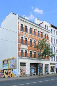 Das Wohnhaus Wurzner Straße 71 steht in offener Blockrandbebauung nahe der Oberschule Ihmelsstraße in Volkmarsdorf.