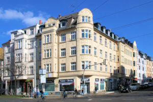 Das Wohnhaus Zweinaundorfer Straße 1 in Anger-Crottendorf steht geschlossener Bebauung zwischen dem Ramdohrschen Park und dem Lene-Voigt-Park.