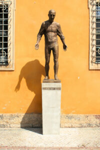 Das Denkmal für Christian Wolff steht am Christian-Wolff-Haus in Halle (Saale).