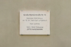 - Große Märkerstraße 12 / Barockes Wohnhaus, / im 19. Jh. Mehrfach umgebaut / Hier wohnte / 1863 – 1868 Pädagoge / Otto Nasemann