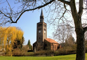 - Klinkerbau, Ecklisenen, Rundbogenfenster, polygonale Apsis, Turm auf quadratischem Grundriss, Zeltdach und Laterne