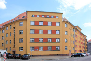 Die Wohnanlage Wilhelm-Plesse-Straße/Otto-Adam-Straße in Gohlis steht in geschlossener Blockrandbebauung nahe der Versöhnungskirche Gohlis.