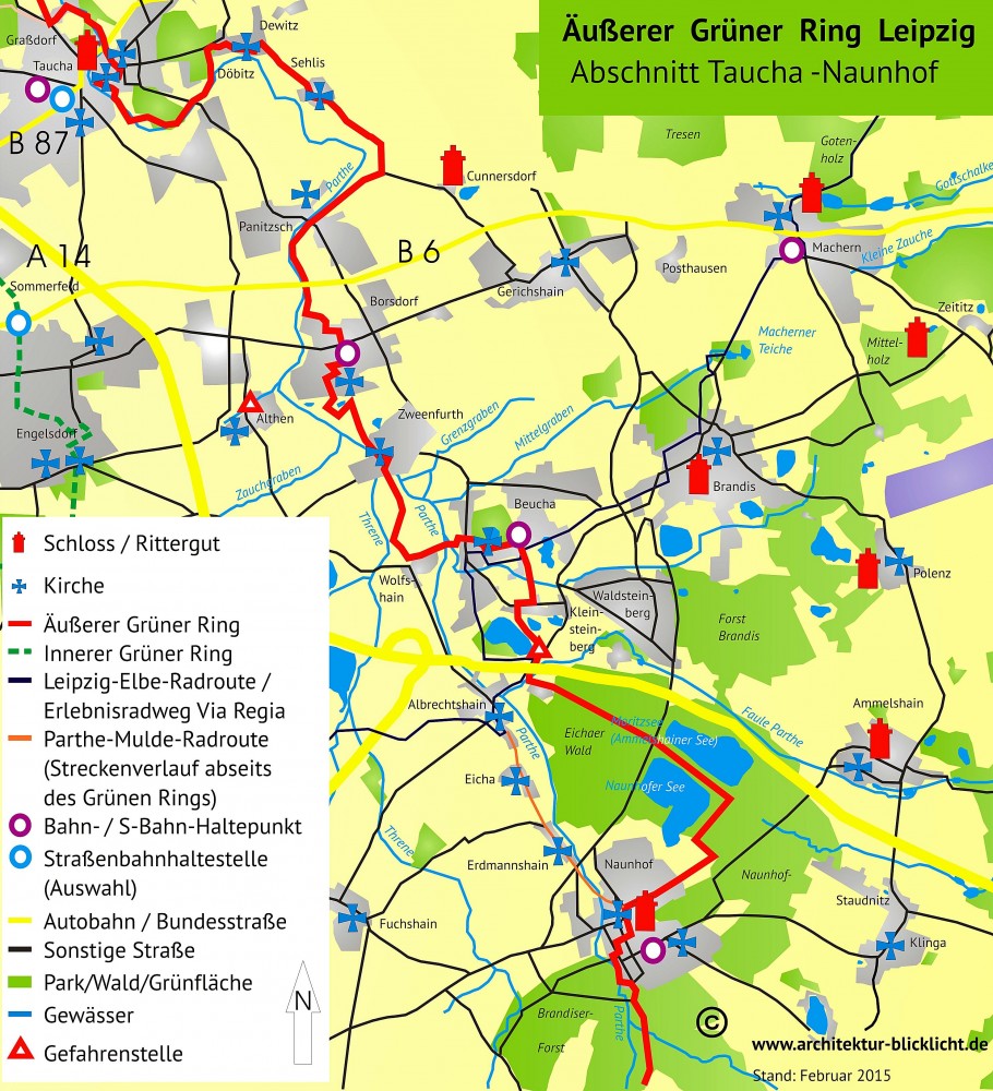 Der Äußere Grüne Ring Leipzig zwischen der Taucha und Naunhof verläuft zum größten Teil auf wenig befahrenen Straßen und durch Ortslagen. Separate Radwege gibt es zwischen Taucha und Dewitz, Panitzsch und Borsdorf und zwischen Beucha und Naunhof.Vorsicht ist in den Ortslagen geboten, da es hier nicht überall Radwege gibt.