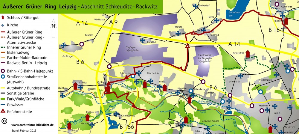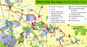 In Rackwitz gibt es einen Haltepunkt der S-Bahn. Die Tour kann also gut auch in zwei Etappen gefahren werden. Der Äußere Grüne Ring Leipzig (Hauptartikel).