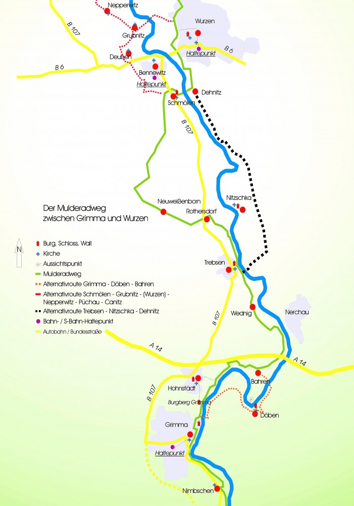 Von Grimma verläuft der Mulderadweg auf der linken Flussseite nach Trebsen und weiter nach Schmölen. Auf einer Fähre muss der Fluss hier überquert werden, bevor man Wurzen erreicht.Weiter geht es von Wurzen am rechten Muldeufer über Nischwitz nach Thallwitz nach Eilenburg.