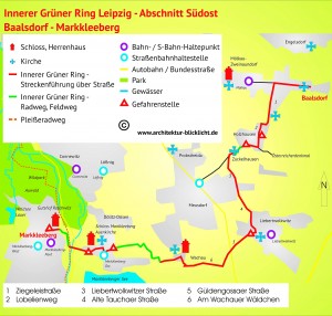 Der Innere Grüne Ring zwischen der Neuen Messe und Baalsdorf führt zum größten Teil über straßenbegleitende Radwege oder durch verkehrsberuhigte Nebenstraßen. Besondere Vorsicht ist in den Ortslagen Holzhausen, Zuckelhausen und Markkleeberg geboten, da es hier keine Radwege gibt.- Länge der Strecke: ca. 16 km