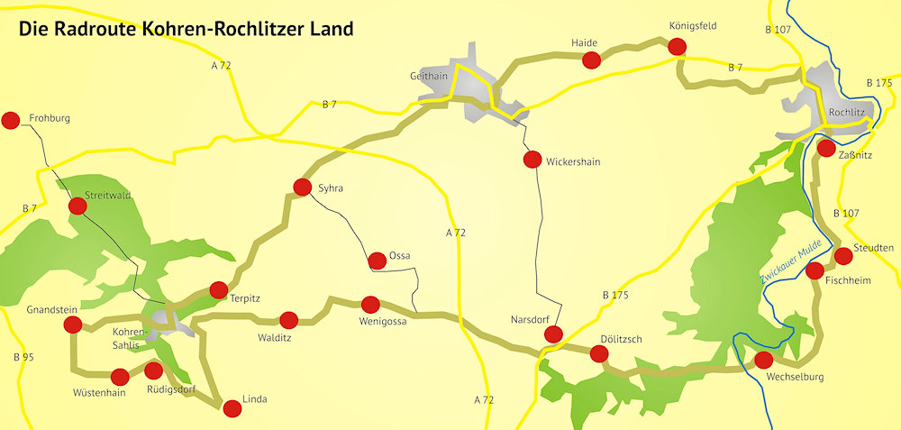 Die Radroute Kohren-Rochlitzer-Land verbindet das Naherholungsgebiet des Kohrener Landes mit der Porphyrlandschaft um Rochlitz. Den Radfahrer erwartet eine anspruchsvolle Radtour durch hügelige Landschaften und das Flusstal der Zwickauer Mulde.Die Radroute Kohren-Rochlitzer-Land ist ein Radrundweg. Als Startpunkt eignet sich die Stadt Geithain, da sie mit dem Zug erreichbar ist. Die Radroute Kohren-Rochlitzer-Land führt von Geithain über Syhra und Terpitz nach Kohren-Sahlis. Weiter über Rüdigsdorf und Wüstenhain erreicht die Radroute Kohren-Rochlitzer-Land die Burg Gnandstein. Über Linda, Walditz, Wenigossa und Narsdorf erreicht der Radfahrer die Zwickauer Mulde bei Wechselburg. Über Fischheim, Steudten und Zaßnitz führt die Radroute nach Rochlitz. Von Rochlitz geht es über Königsfeld zurück nach Geithain.