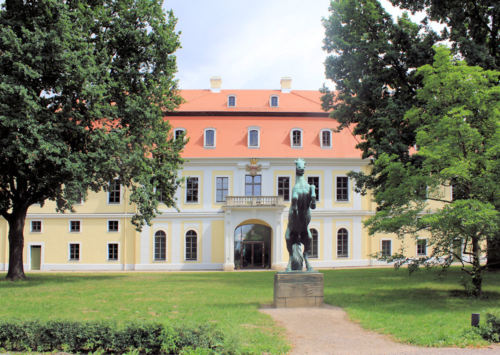 Ich radelte weiter nach Pülswerda. Das stattliche Herrenhaus des Rittergutes wurde nach 1850 im Stil der englischen Neogotik in einem kleinen Park errichtet.Mein nächstes Ziel war das Gestüt in Graditz. Kurfürst Friedrich August I. von Sachsen (August der Starke) ließ es 1725 bis 1726 errichten. 1879 bis 1892 wurden die Ställe außerhalb des Hofes erbaut und 1898 weitere Ställe. Als Architekten wirkten in Graditz Matthäus Daniel Pöppelmann (1725 bis 1726), Christian Friedrich Exner (1775) und Christian Traugott Weinlig (um 1800). Dem Gestüt schließt ich ein großer Park an.