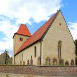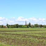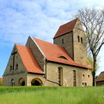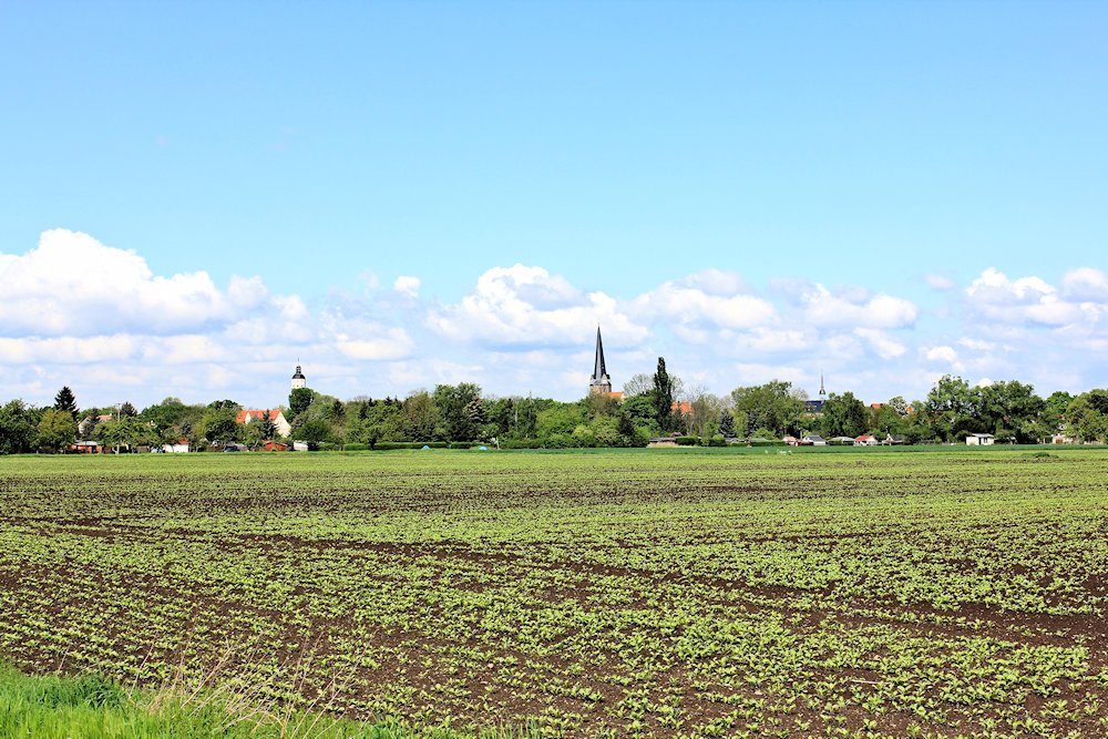 Durch Felder führt der Elster-Saale-Radweg nach Meuchen in Sachsen-Anhalt. In der Ortsmitte von Meuchen steht die romanische Wehrkirche.
