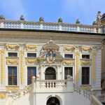 - Putzfassade, allseitige Gliederung durch flache Pilsater mit ionischen Kapitellen und Girlanden, Sandsteinbalustrade, rundbogiges Portal mit Segmentbogengiebel mit Stadtwappen, Freitreppe