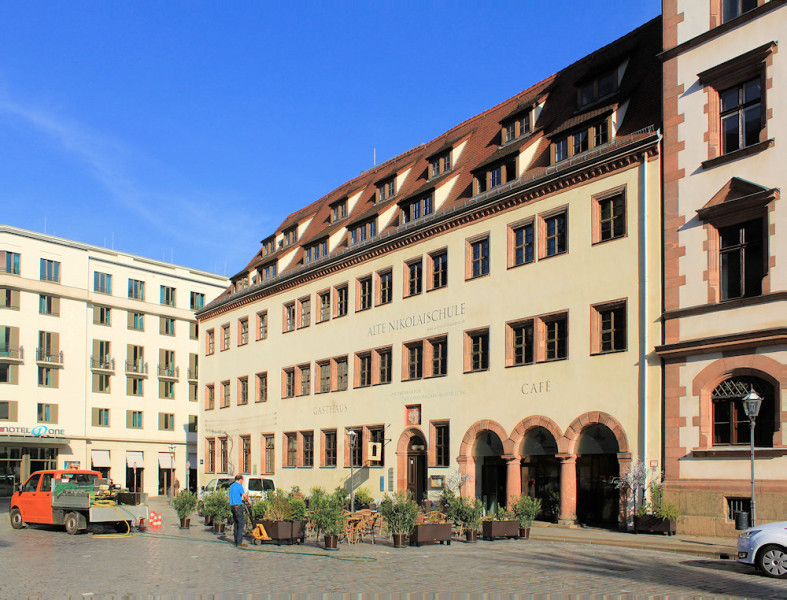 Die Alte Nikolaischule in Leipzig steht intergriert in die Blockrandbebauung am Nikolaikirchhof, neben der Nikolaikirche.