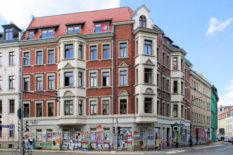 Das Wohnhaus Zweinaundorfer Straße 28 in Anger-Crottendorf steht in geschlossener Blockrandbebauung nahe dem Liselotte-Herrmann-Park.