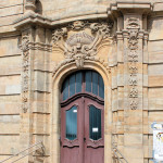- Sandsteinfassade, dreiachsiger Mittelrisalit mit Lisenen, Giebel und Portal, zwei Seitenrisalite mit Gaube, Fassadengestaltung mit Lisenen und Gesimsen