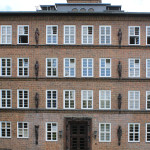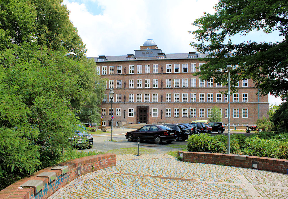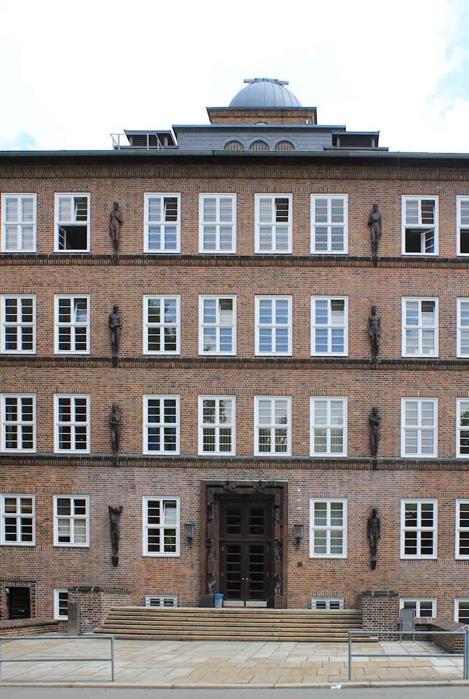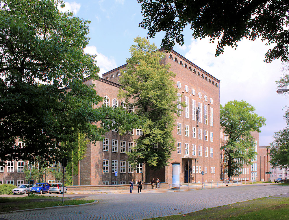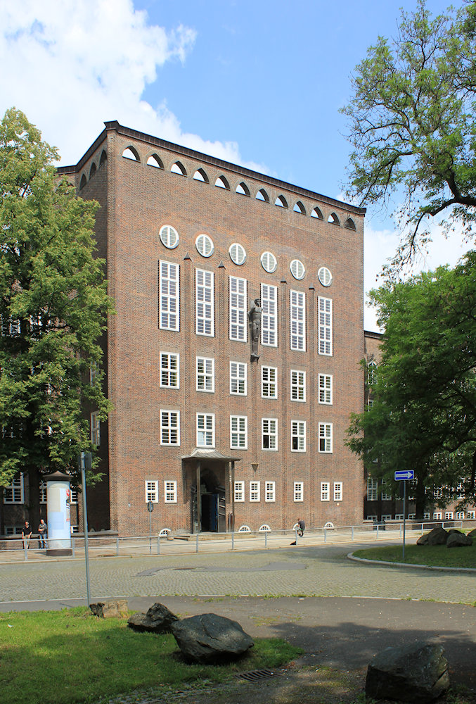 - Stahlbetonskelettbauweise mit dunkler Klinkerfassade, Hauptteil vertikal betont durch dreiecksförmig aus der Fassade heraustretende Lisenen, oberste Fensterreihe spitzwinklig, östlicher Teil durch Gesimse gegliedert, überlebensgroße Plastiken