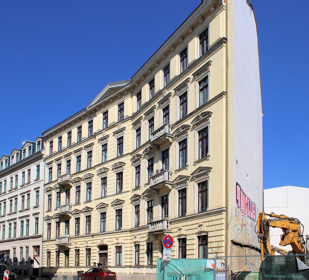 Das Haus Blaue Mütze in Leipzig steht in geschlossener Blockrandbebauung gegenüber dem Naturkundemuseum.