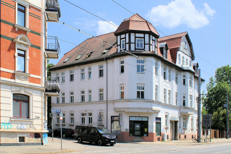 Das Wohnhaus Bornaische Straße 221 nahe dem AGRA-Messepark in offener Bebauung.