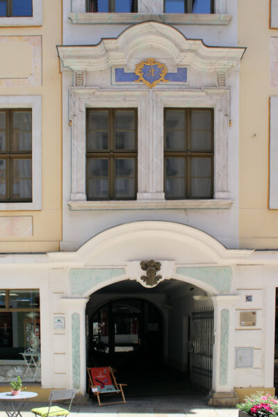 Putzfassade, Betonung der Mittelachse durch Portaldurchfahrt und Fensterverdachung, Fensterrahmungen