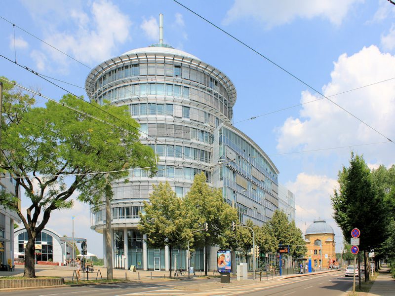 Das Center am Torgauer Platz in Schönefeld steht als Solitärbau auf einer Grünfläche.