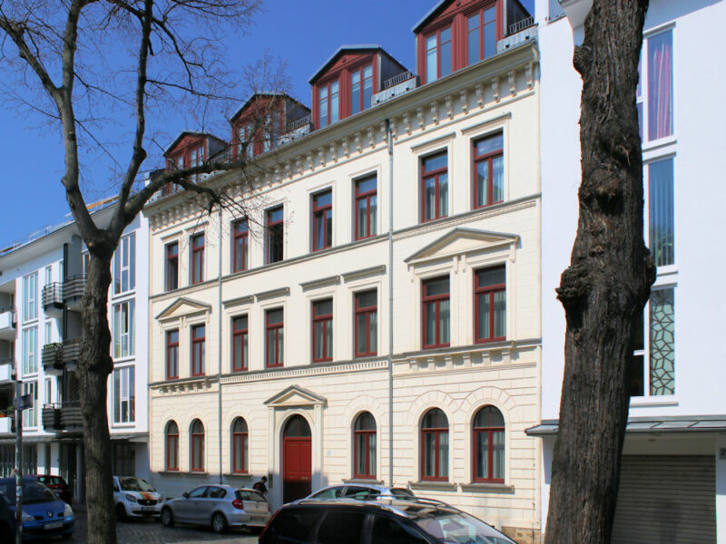 Das Wohnhaus Chopinstraße 27 in Leipzig steht im Graphischen Viertel am Marienplatz in geschlossener Blockrandbebauung.