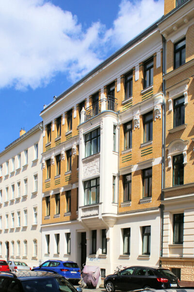 Das Wohnhaus Cichoriusstraße 17 in Anger-Crottendorf steht geschlossener Blockrandbebauung zwischen dem Lene-Voigt-Park und dem Ramdohrschen Park.