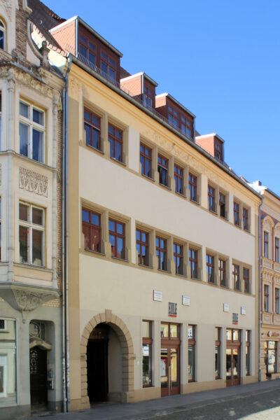 Das Wohnhaus Collegienstraße 81 steht zwischen dem Augusteum und dem Markt in Wittenberg in geschlossener Bebauung.