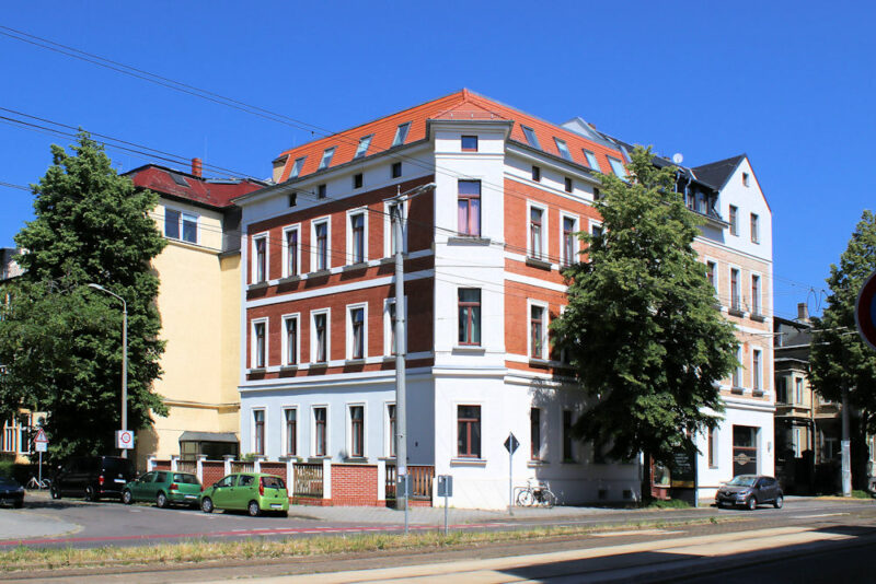 Das Wohnhaus Delitzscher Straße 23 in Eutritzsch steht zwischen dem Eutritzscher Markt und dem Chausseehaus in offener Bebauung.