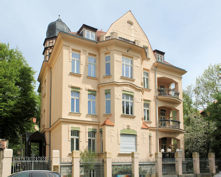 Das Wohnhaus Dölitzer Straße 45 in Connewitz steht neben dem Theodor-Mommsen-Gymnasium in offener Blockrandbebauung.
