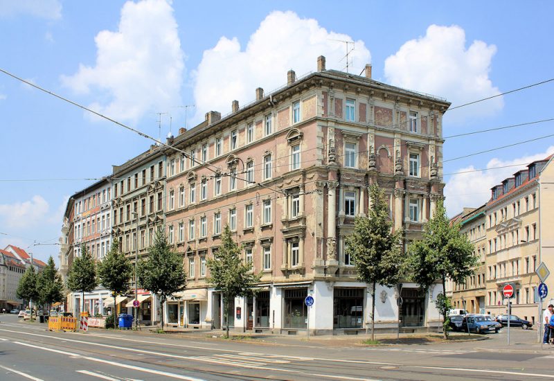 Das Wohnhaus Dresdner Straße 79 in Neustadt-Neuschönefeld steht in geschlossener Blockrandbebauung markant an einer Straßenkreuzung.