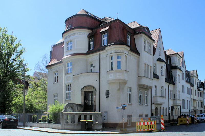 - Putzfassade, halbovaler Standerker, polygonaler Eckerker, Kastenerker, Jugendstilornamentik