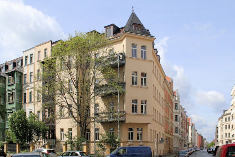 Das Wohnhaus Eilenburger Straße 38 in Reudnitz steht am Möbiusplatz in geschlossener Blockrandbebauung.