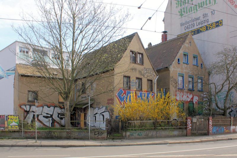 Die Wohnhäuser Erich-Zeigner-Allee 1/1a in Lindenau stehen nahe dem Palmengarten und sind Zeugnis der ursprünglich ländlichen Bebauung.