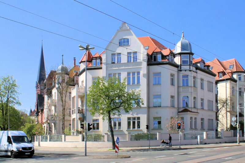 Das Wohnhaus Erich-Zeigner-Allee 16 in Plagwitz steht nahe der Heilandskirche in offener Blockrandbebauung.
