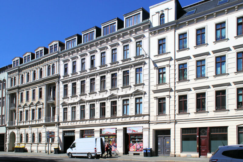 Das Wohnhaus Eutritzscher Straße 11 in Leipzig steht in geschlossener Blockrandbebauung zwischen dem Hauptbahnhof und dem Nordplatz.