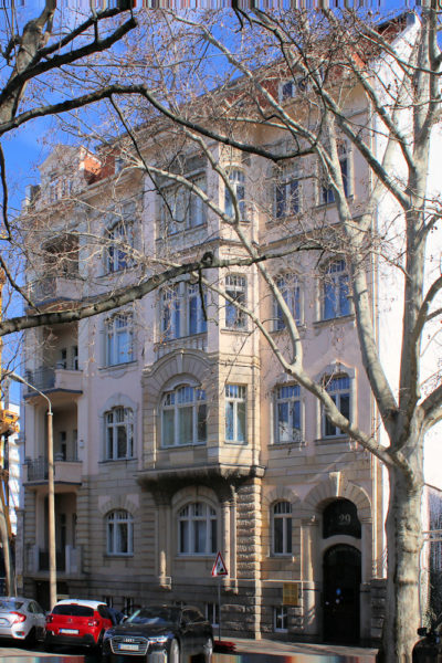 - Putzfassade mit Sandsteingliederungen und Stuckdekoration, polygonaler Erker mit üppig rankendem Baumgeäst, konvex schwingende Balkons