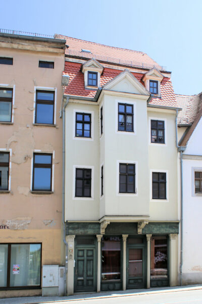 Das Wohnhaus Fischstraße 1 steht zwischen Altmarkt und Roßmarkt in Zeitz in geschlossener Blockrandbebauung.