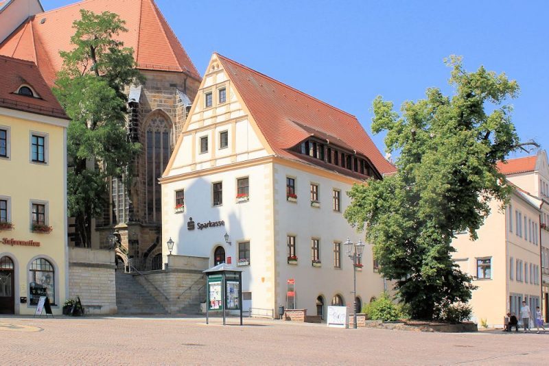 Das Gebäude der ehem. Fleischbänke und Garküche steht am nordwestlichen Rand des Neumarktes von Oschatz vor der Stadtkirche.