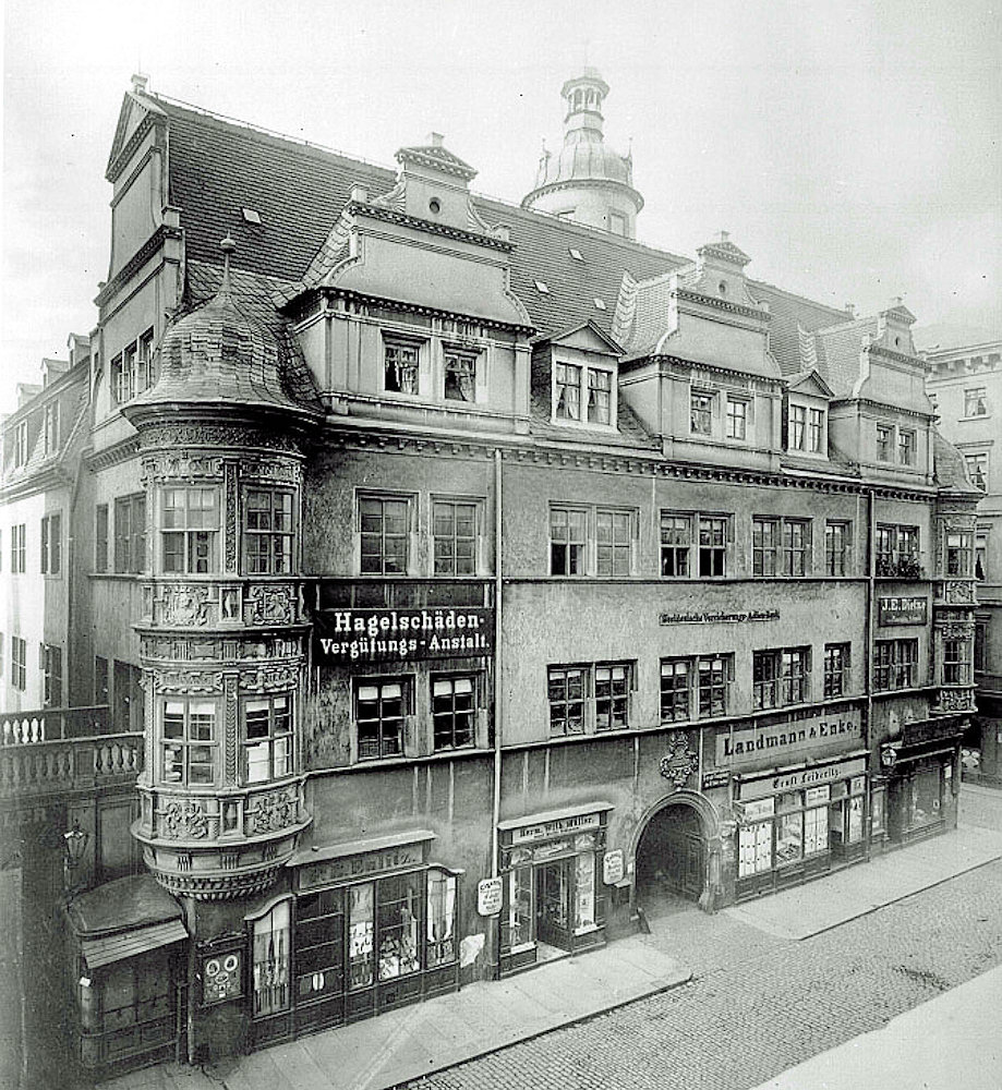 Das Gebäude mit dem Fürstenhauserker in Leipzig steht an der Kreuzung Grimmaische Straße / Nikolaistraße, unweit der Nikolaikirche.