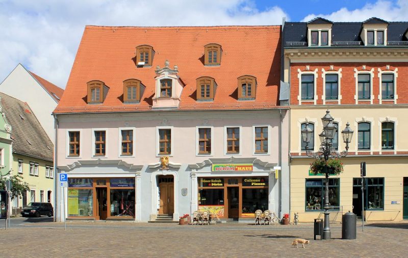 Der ehem. Gasthof „Zum Goldenen Adler“ in Wurzen steht am Markt in Blockrandbebauung.