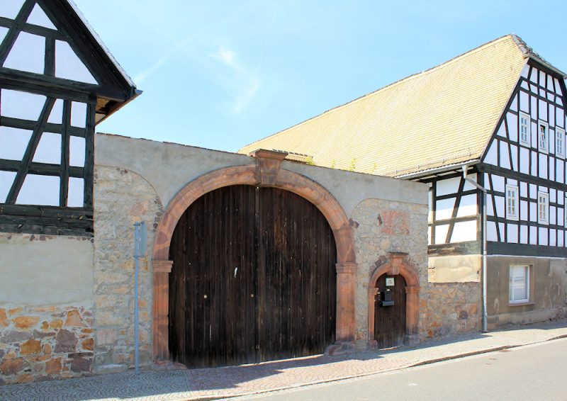 - Fachwerk über massivem Erdgeschoss, Toranlage Bruchsteinmauerwerk, rundbogige Durchfahrt und rundbogige Pforte mit Porphyrgewänden und Schlussstein