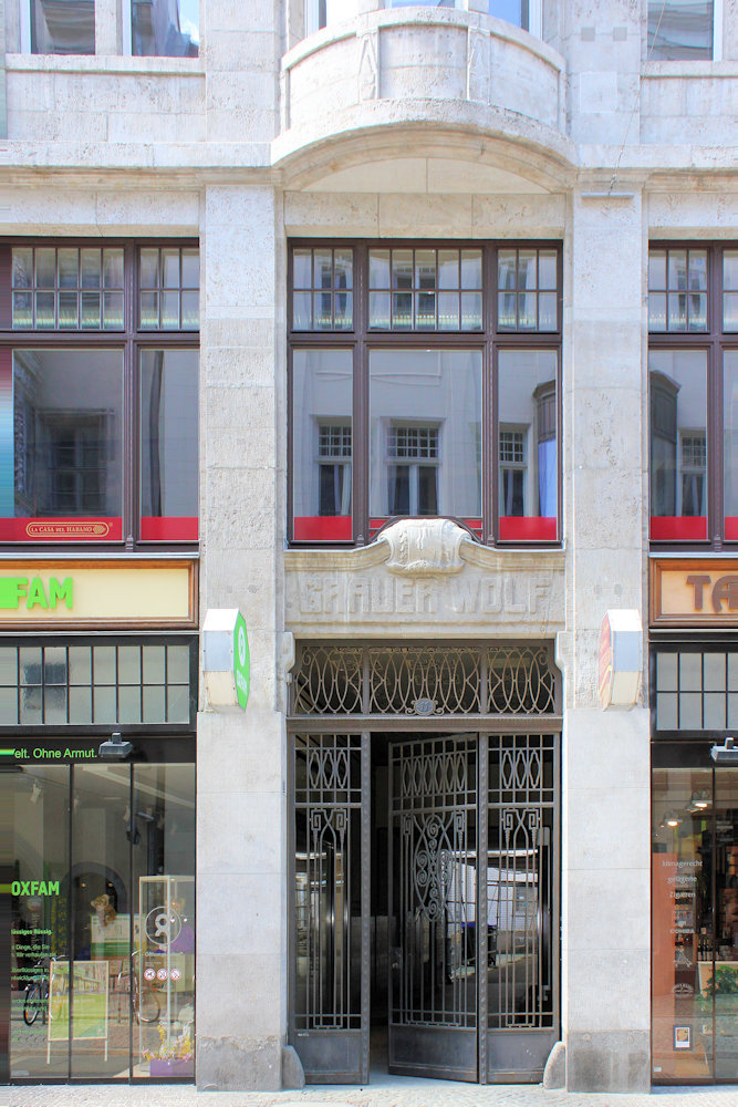 Das Geschäftshaus „Grauer Wolf“ in Leipzig steht in der Innenstadt zwischen Markt und Brühl in Blockrandbebauung.