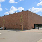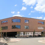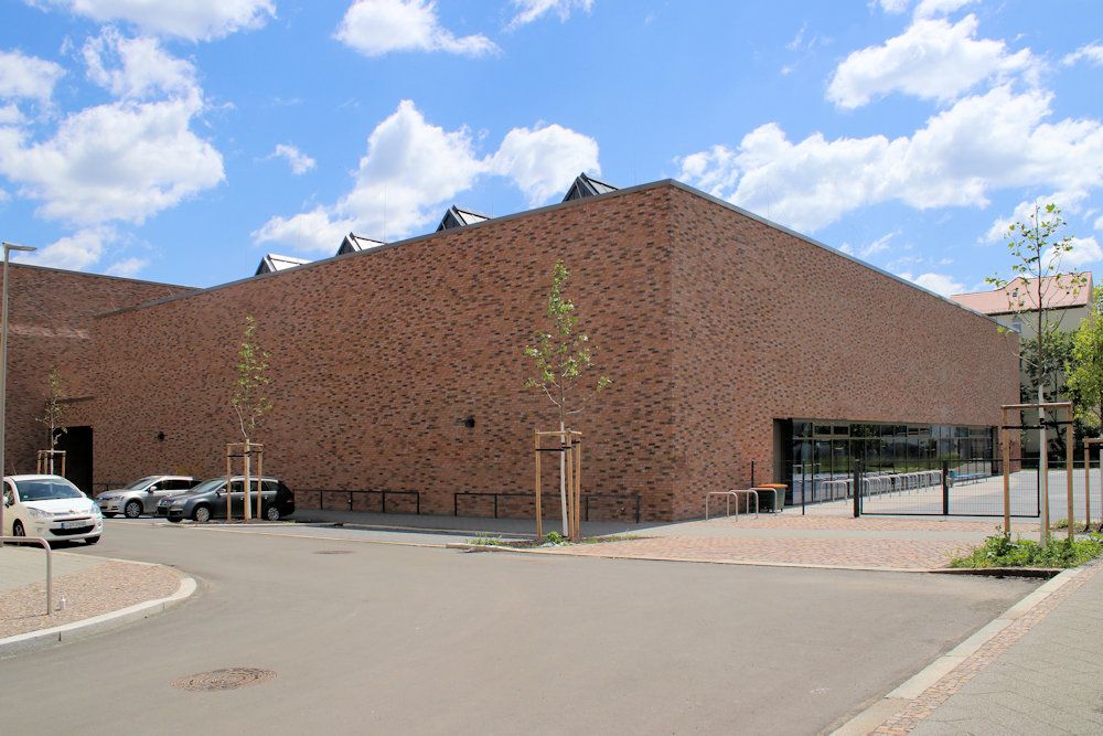 - langgestreckter, abgewinkelter Baukörper, dahinter Turnhalle mit Verbindungsbau