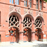 - Putz-Klinker-Fassade, Mittelrisalit mit Giebel, Fensterverdachungen, Portal mit neogotischen Formen
