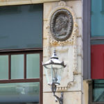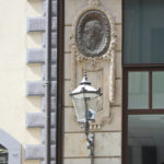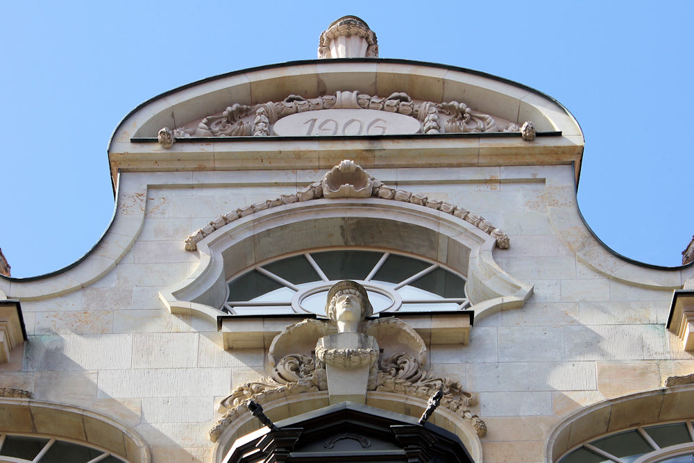 Sandsteinverkleidung, späthistoristische Formen mit Anklängen des Neubarocks und Zopfstils, kupferverkleideter Erker, Zwerchgiebel, Medaillons von Friedrich Schiller und seiner Frau Charlotte (?)