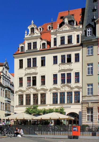 Das Haus „Zum Weinstock“ in Leipzig steht am Markt an der Ecke zur Hainstraße in Blockrandbebauung.
