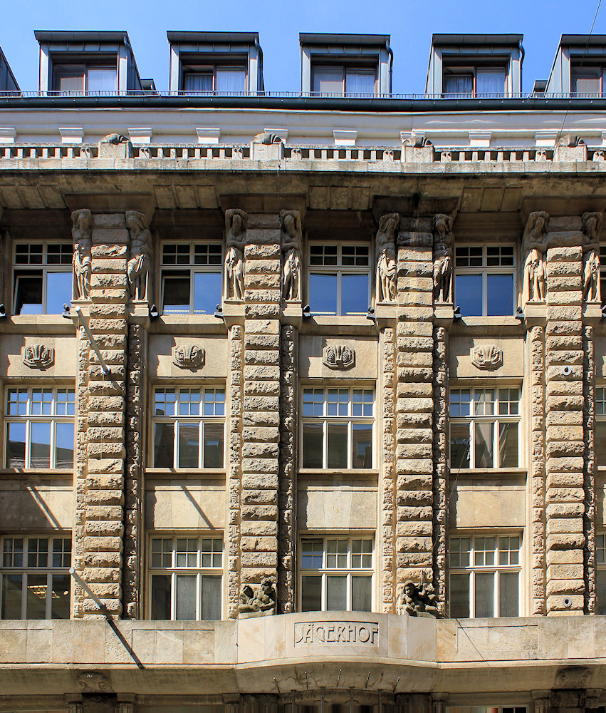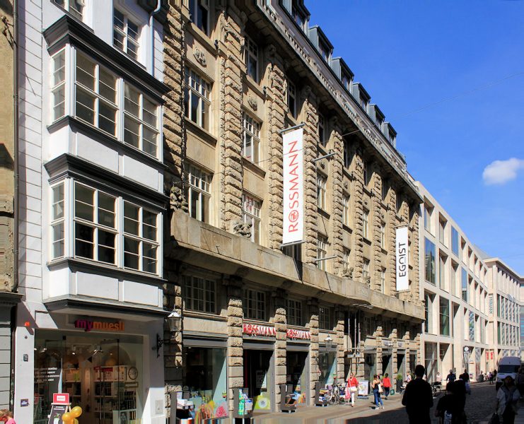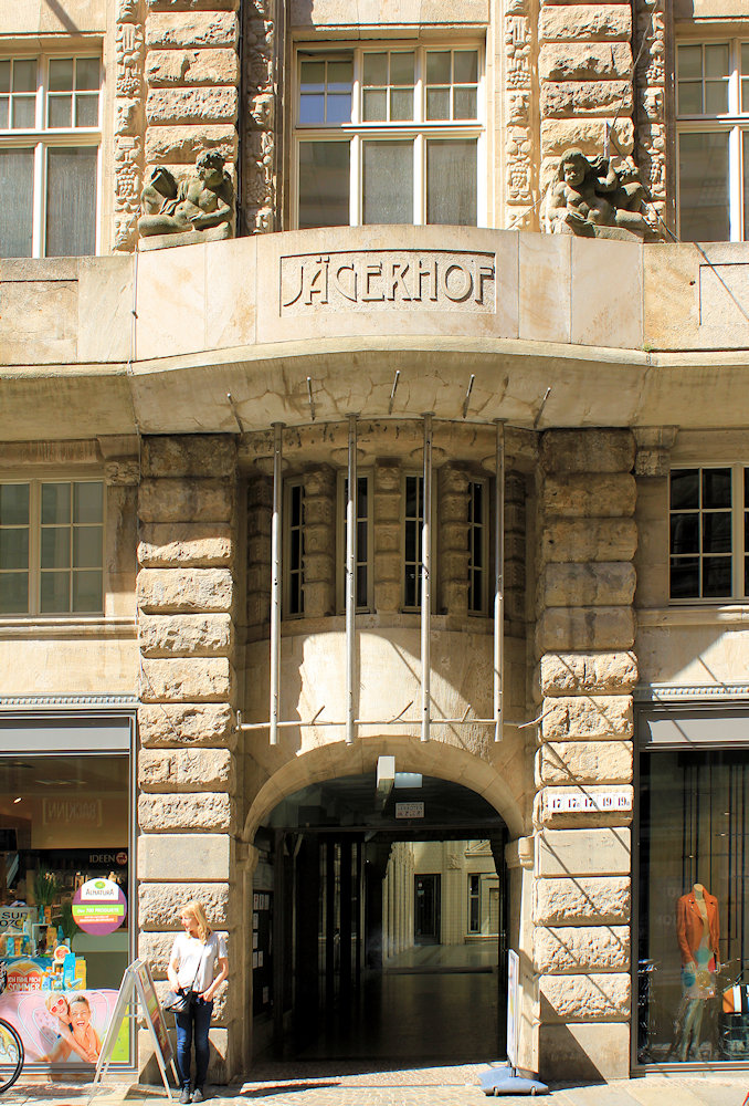 Der Jägerhof in Leipzig steht in Blockrandbebauung, die Jägerhofpassage verbindet die Hainstraße mit der Großen Fleischergasse, nahe dem Brühl.