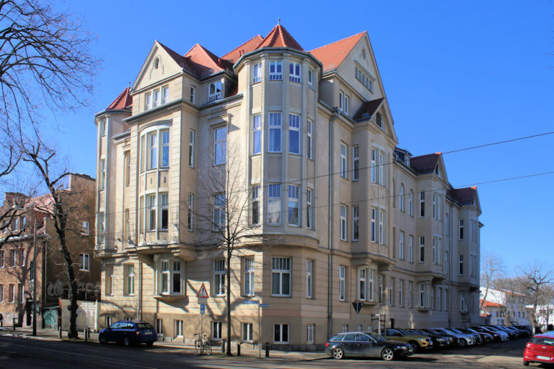 Das Wohnhaus Käthe-Kollwitz-Straße 72 in Leipzig steht im Bachviertel zwischen Westplatz und Elsterbecken in offener Bebauung.