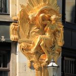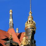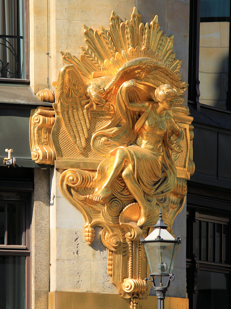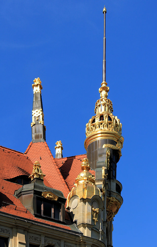 - Natursteinfassade, Giebelaufbau mit Ecktürmchen und laternenartigem Abschluss, vergoldete Fassadenornamente